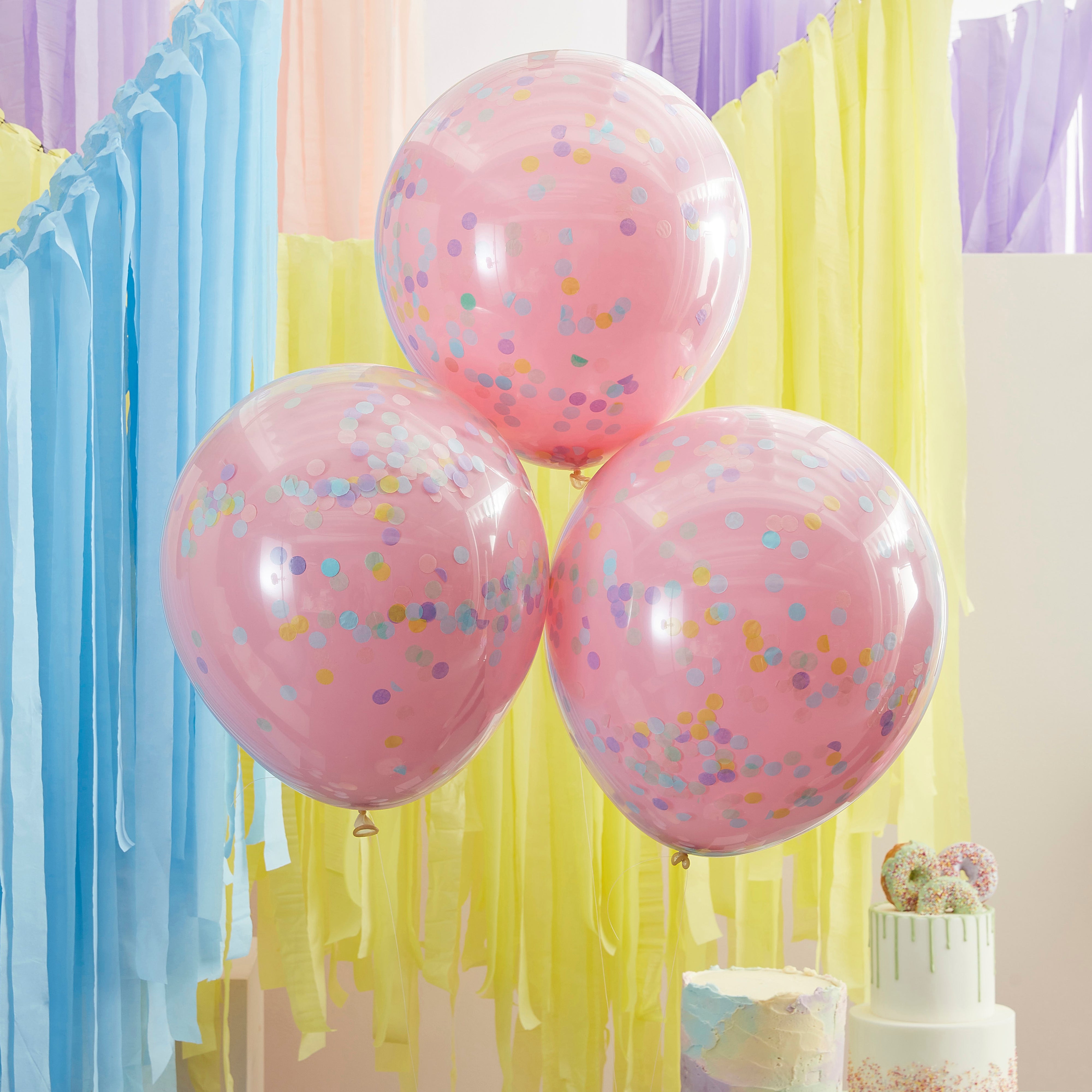 - 3 x 18" Double Layered Pink Balloons with Pastel Rainbow tissue confetti.